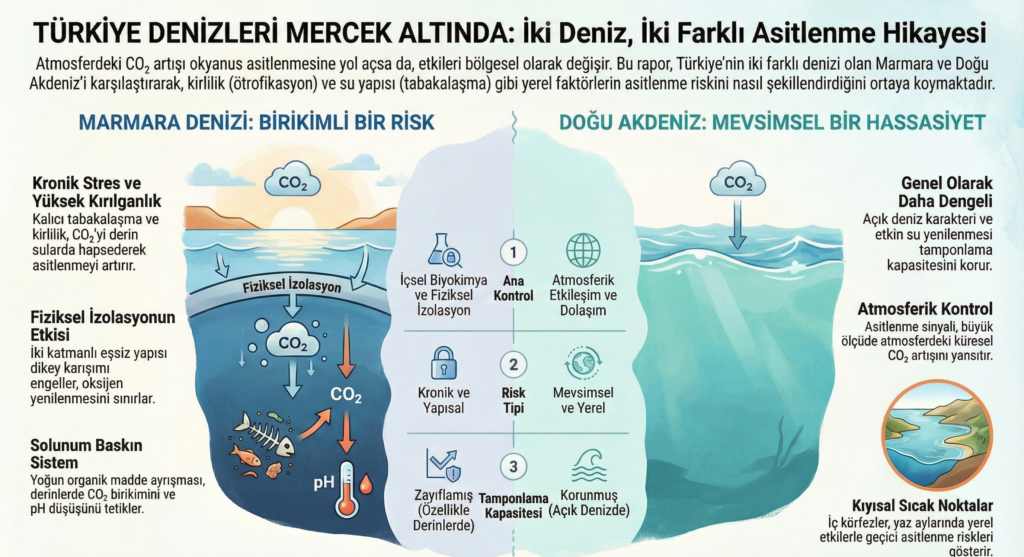 Özetle, Marmara’nın en büyük düşmanı kendi içinde ürettiği CO₂ iken, Akdeniz’in temel mücadelesi atmosferden gelen küresel CO₂ artışına karşıdır.